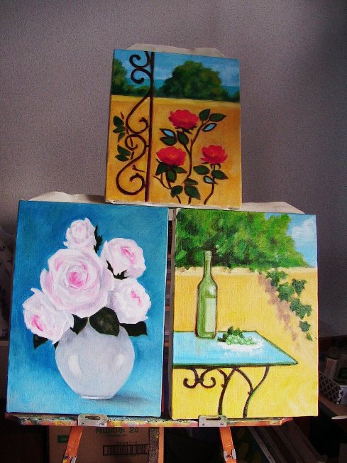 | 夜風が冷え冷えとして秋らしくなって。 やっと睡眠がとれている。 この夏のように夜中に何度も目を覚ますことが、 前にもあった気がすると思ったら、産後の1ヶ月がこんなだった。 しかも確か気温0度に近い真夜中だったし なかなか泣き止まないということもあったから ボタンひとつでエアコンをつけたりするだけで目を覚ますなら 実はどうってことはない気がする。 とにかくそういうわけで油絵もはかどっている。 3点が完成間近。バラを描いている。バラの描き方を忘れかけていたが じっくり取り組んでいるうちにじき完成というところまでいつの間にか。 まえより上達してる気もする。 |